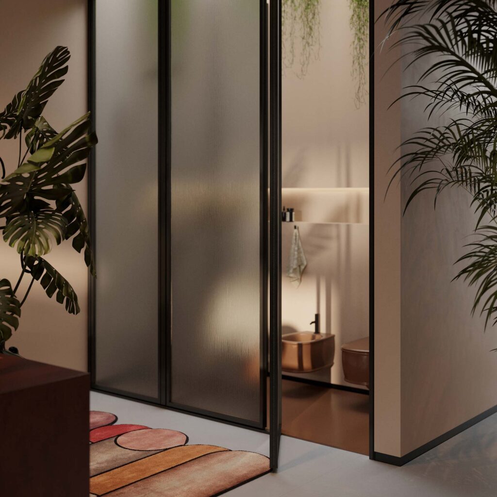 Spaces nasce come sistema modulare in cui il cristallo è assoluto protagonista. Elemento versatile e raffinato, delinea e definisce gli ambienti come elemento separatore verticale o si trasforma in piano d’appoggio per lavabi e contenitori dal design elegante e raffinato.